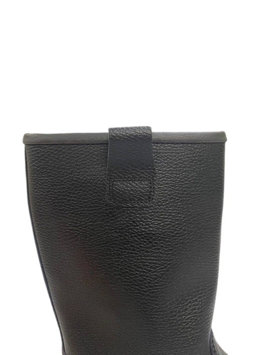 Сапоги сварщика — это специальная рабочая обувь из термостойкой кожи, обеспечивает защиту от нефти, нефтепродуктов, механических воздействий, растворов кислот концентрации до 20%, кратковременного (60 сек.) контакта с поверхностями, нагретыми до температуры 300°С, от искр, брызг расплавленного металла, окалины, от скольжения по зажиренным, мокрым и обледенелым поверхностям, от общих производственных загрязнений. Они имеют укрепленный металлический подносок (200 Дж) для защиты от ударов и проколов, термостойкую двухслойную подошву (ПУ/нитрил) с МБС, КЩС свойствами. Голенище сапог с петлями (проушинами) предотвращает попадание внутрь обуви окалины и брызг расплавленного металла.