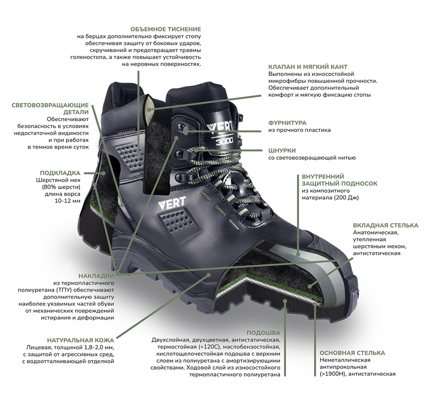 Обувь серии VERT 3000 — безупречное сочетание стиля, комфорта и современных технологий! Коллекция отличается стильным дизайном, использованием высококачественных современных материалов и уникальной колодкой повышенного комфорта. Анатомическая стелька помогает минимизировать утомляемость и обеспечивает отличную поддержку стопы даже при длительной носке. Обувь серии VERT 3000 гарантирует надежную защиту от агрессивных сред и механических воздействий, что делает ее идеальным выбором для работы в самых разных отраслях промышленности. Высокие стандарты качества и технологичные решения обеспечивают безопасность и комфорт в любых условиях. VERT — защита и стиль без компромиссов!