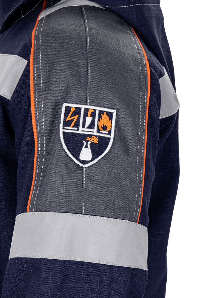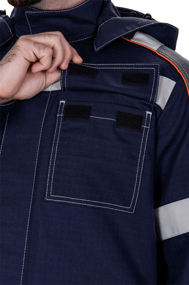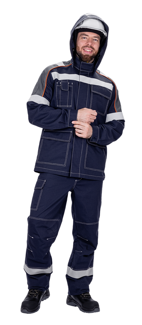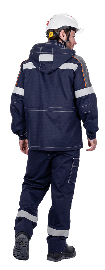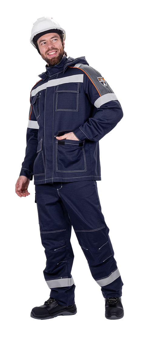 В костюме используется огнестойкая световозвращающая полоса шириной 50 мм. Огнестойкие нитки Nomex.