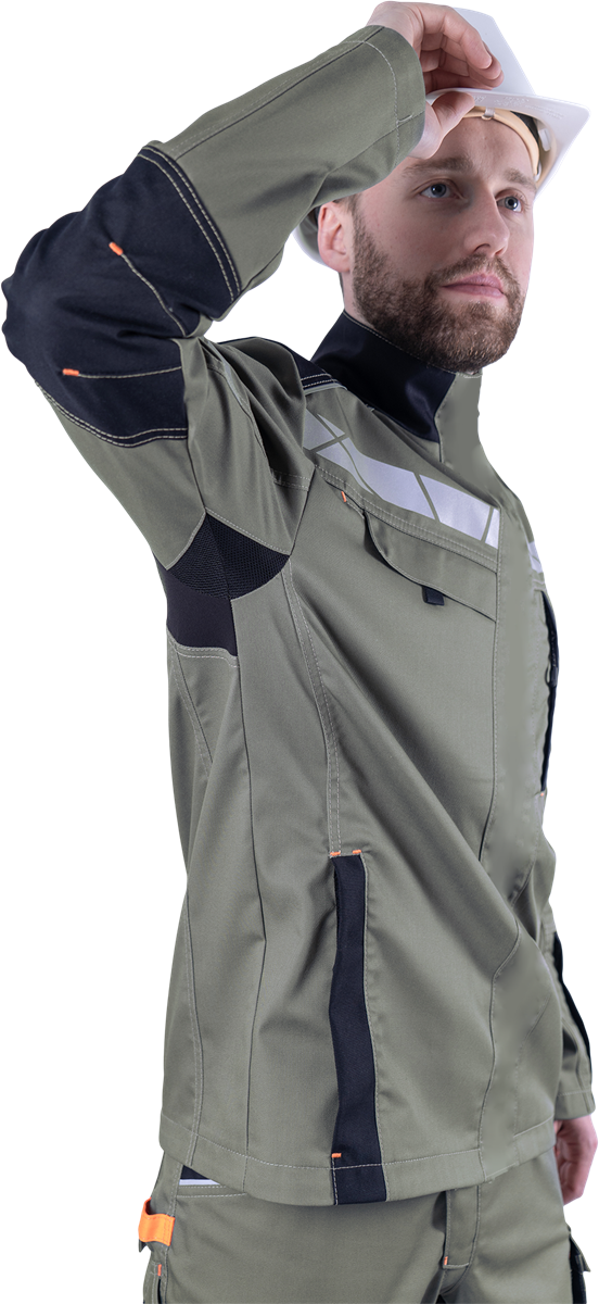• рукава, соответствующие естественному положению рук при работе, налокотники с вытачками из износостойкой ткани (100% полиамид 6.6)