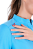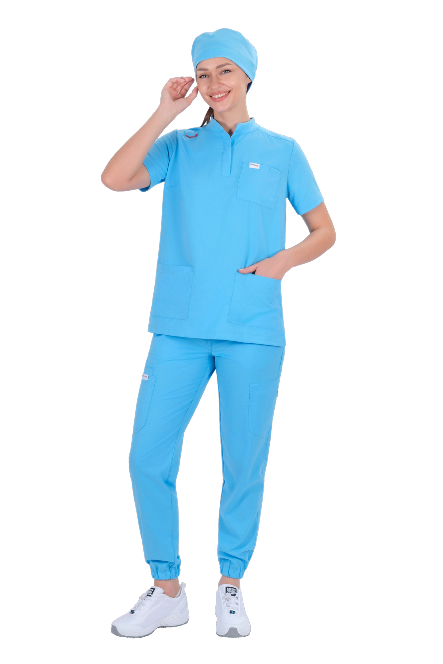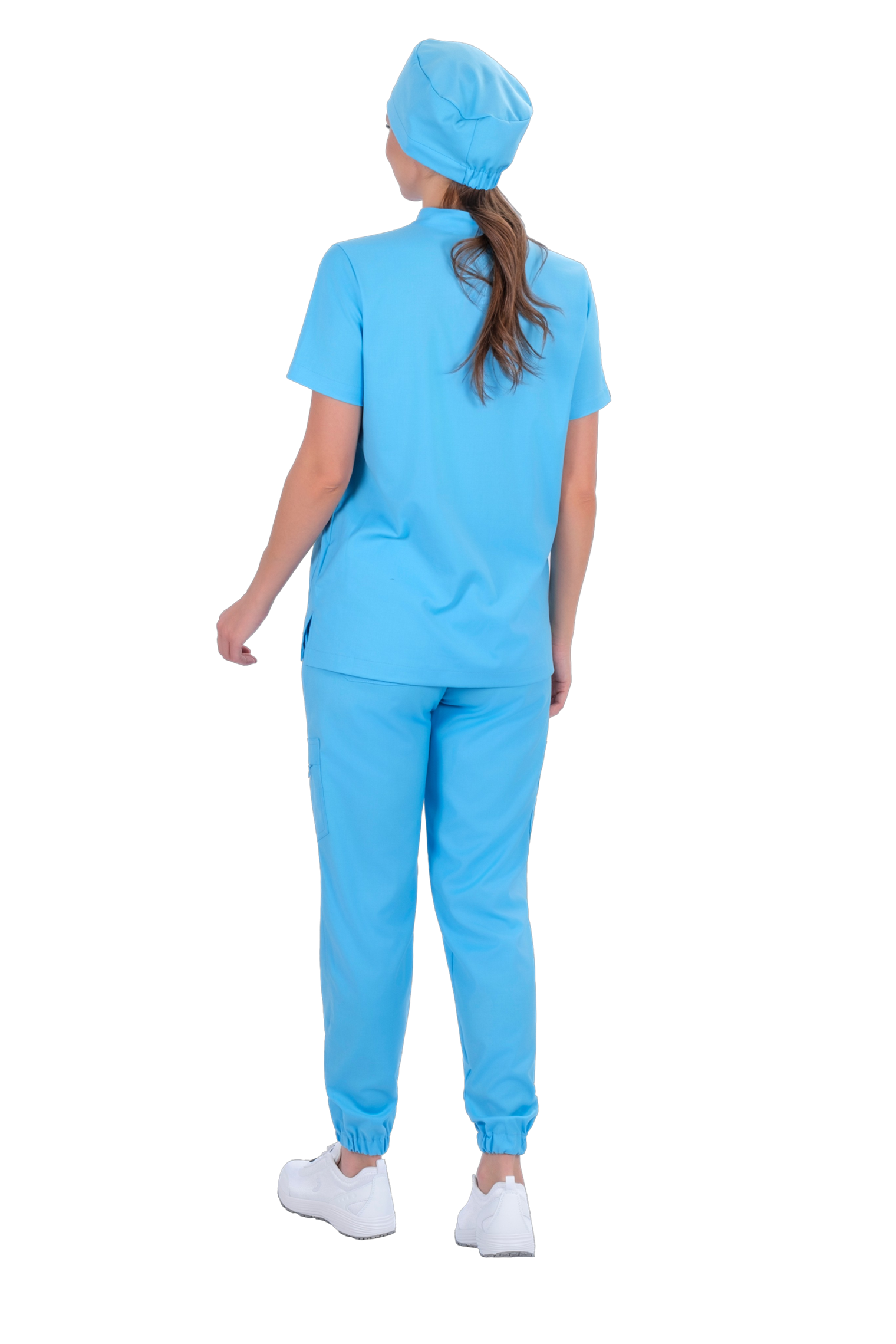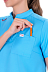 Блуза прямого силуэта. Воротник-стойка. Застёжка-планка на две потайные пуговицы. Рукава кроткие втачные. Карманы: нагрудный слева с отделением для мелких предметов, нижние боковые. Разрезы внизу боковых швов. В правом плечевом шве расположена петля для бейджа.