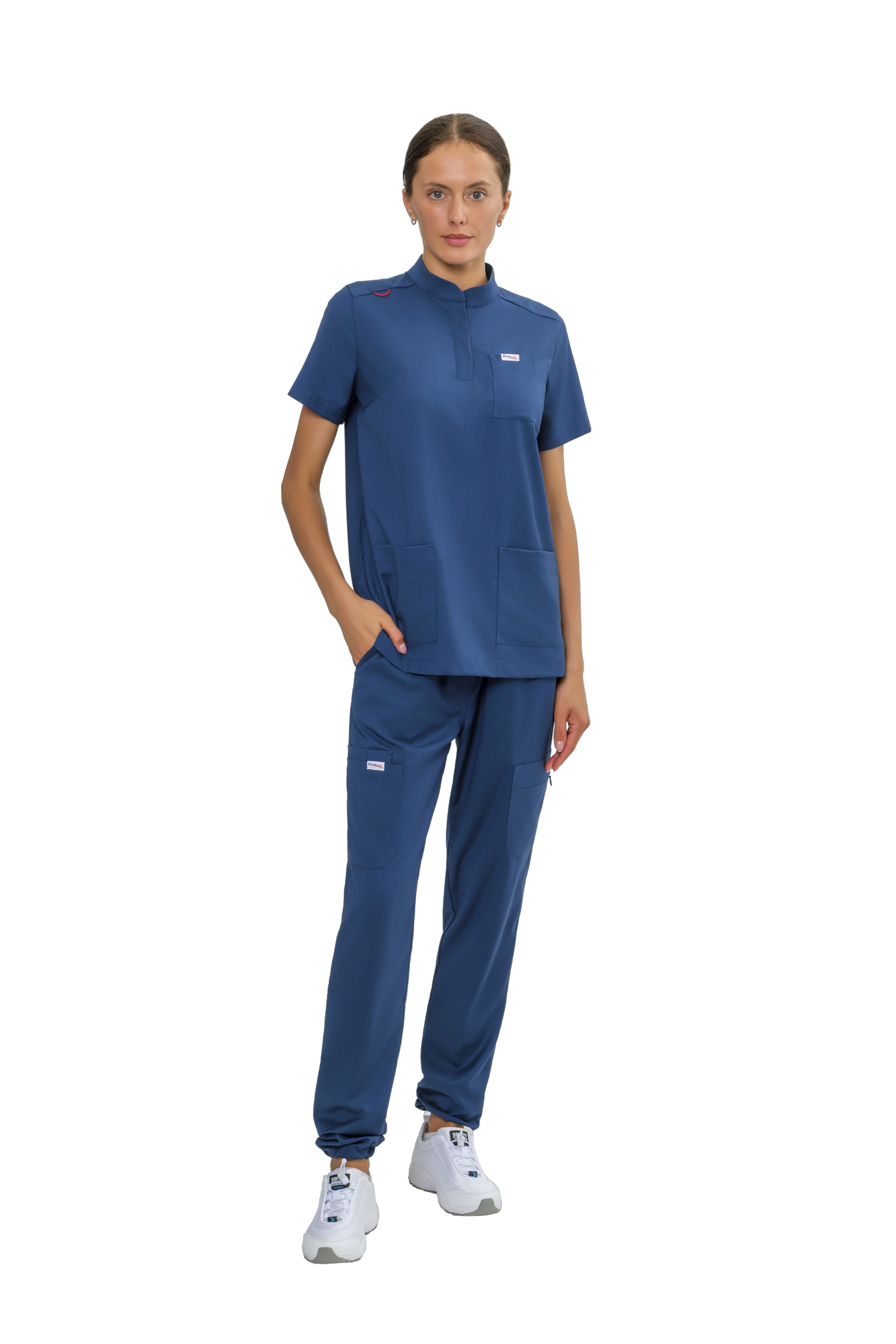 На уровне боковых швов расположены 3 накладных кармана: левый -накладной карман фигурной формы вход в карман с застежкой-молния, правый -большой накладной карман фигурной формы и малый накладной карман расположен под правым большим карманом, вход в карман разделенный на две секции.