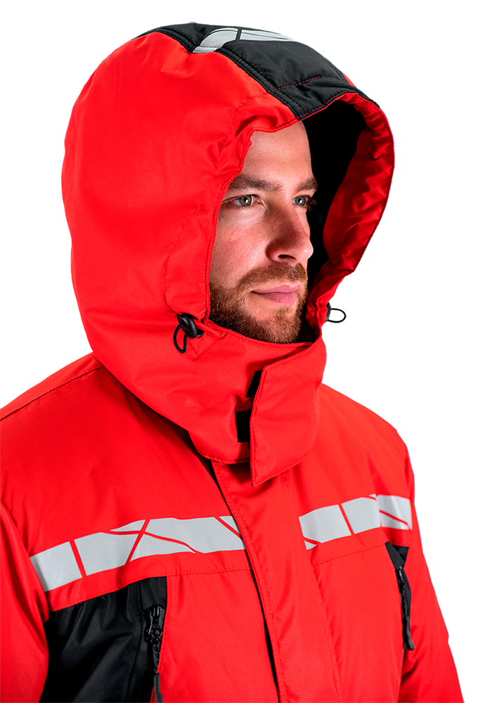 • термоклеевые световозвращающие полосы шириной 30 мм на кокетках полочки и спинки, внизу рукавов, брюк, на центральной части капюшона